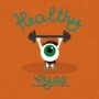 A caricature of an eye lifting a barbell with Healthy Eyes in Script on background.
