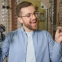 Portrait of male client holding and wearing different-spectacles.